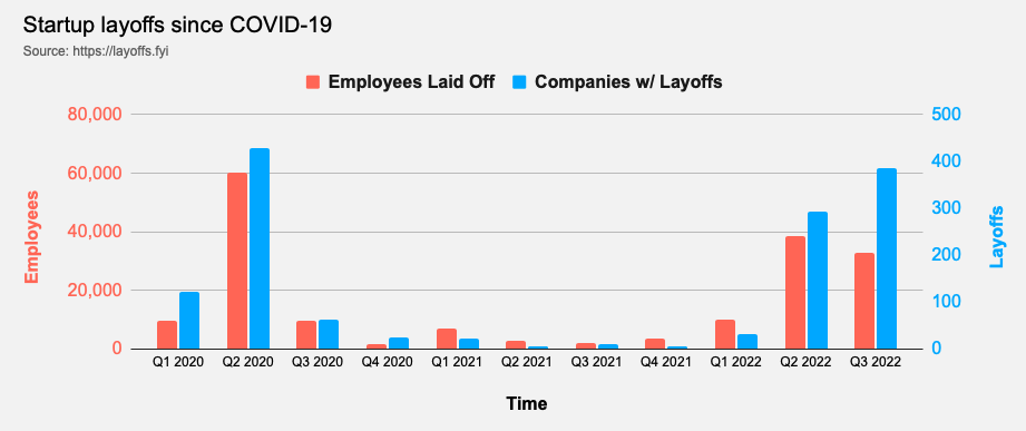 News today that a prestigious research firm forecasted a 98% chance of a global recession joins a growing chorus of analysts, from the World Trade Organization to the International Monetary Fund and even the World Bank, reporting on dramatic economic slowdown and shrinkage in the third quarter. (Some, like The Market Sniper's Francis Hunt, expect a global depression.) While it is too early to know the depth and breadth of the downturn, its impacts have been felt across the technology, finance, real estate, and retail sectors, principally because so many of these industries have been reliant upon cheap and easy financing which has now largely evaporated. Layoff Charts show that reductions in force and company bankruptcies are approaching (and exceeding, in the aggregate) highs seen during the start of the COVID-19 pandemic in 2020 and are accelerating.